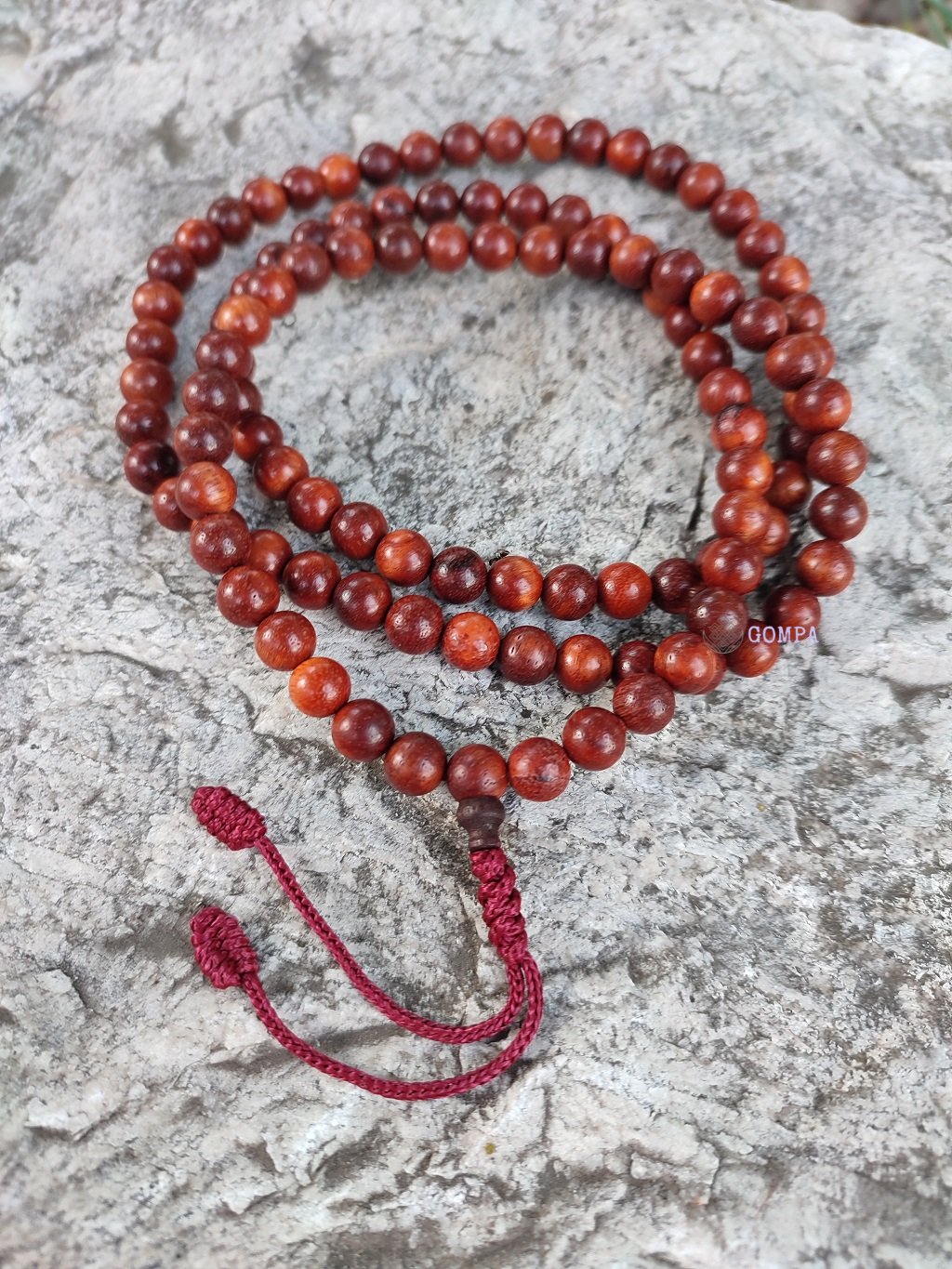 Mala buddhista meditációhoz, 108 db rózsafa gyönggyel (8 mm) és guru szemmel. Amikor egy mala elszakad, általában karmikus esemény következménye, ezután el szokták égetni. Azonban van lehetőség újrafűzésre is, melyről üzenetben érdeklődhet. A malát tiszteletben kell tartani, nem érhet hozzá idegen, nem tesszük le az oltáron kívül máshova, csak malatartóban.