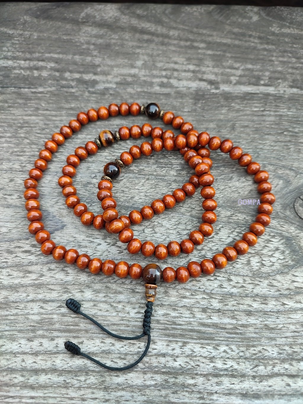 Mala buddhista meditációhoz, 108 db kávé színű, fa gyönggyel (kb. 8 mm), tigrisszem osztóval. Gumiszálra fűzött. Amikor egy mala elszakad, általában karmikus esemény következménye, ezután el szokták égetni. Azonban van lehetőség újrafűzésre is, melyről üzenetben érdeklődhet. A malát tiszteletben kell tartani, nem érhet hozzá idegen, nem tesszük le az oltáron kívül máshova, csak malatartóban.