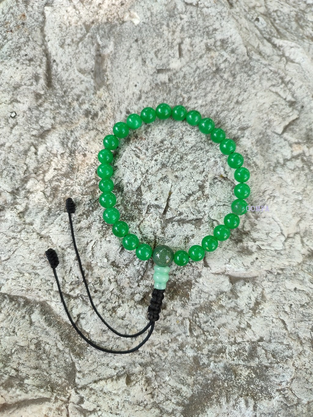 Mala buddhista meditációhoz, 27 db zöld jáde féldrágakő gyönggyel (6 mm). Állítható méretű. Amikor egy mala elszakad, általában karmikus esemény következménye, ezután el szokták égetni. Azonban van lehetőség újrafűzésre is, melyről üzenetben érdeklődhet. A malát tiszteletben kell tartani, nem érhet hozzá idegen, nem tesszük le az oltáron kívül máshova, csak malatartóban.