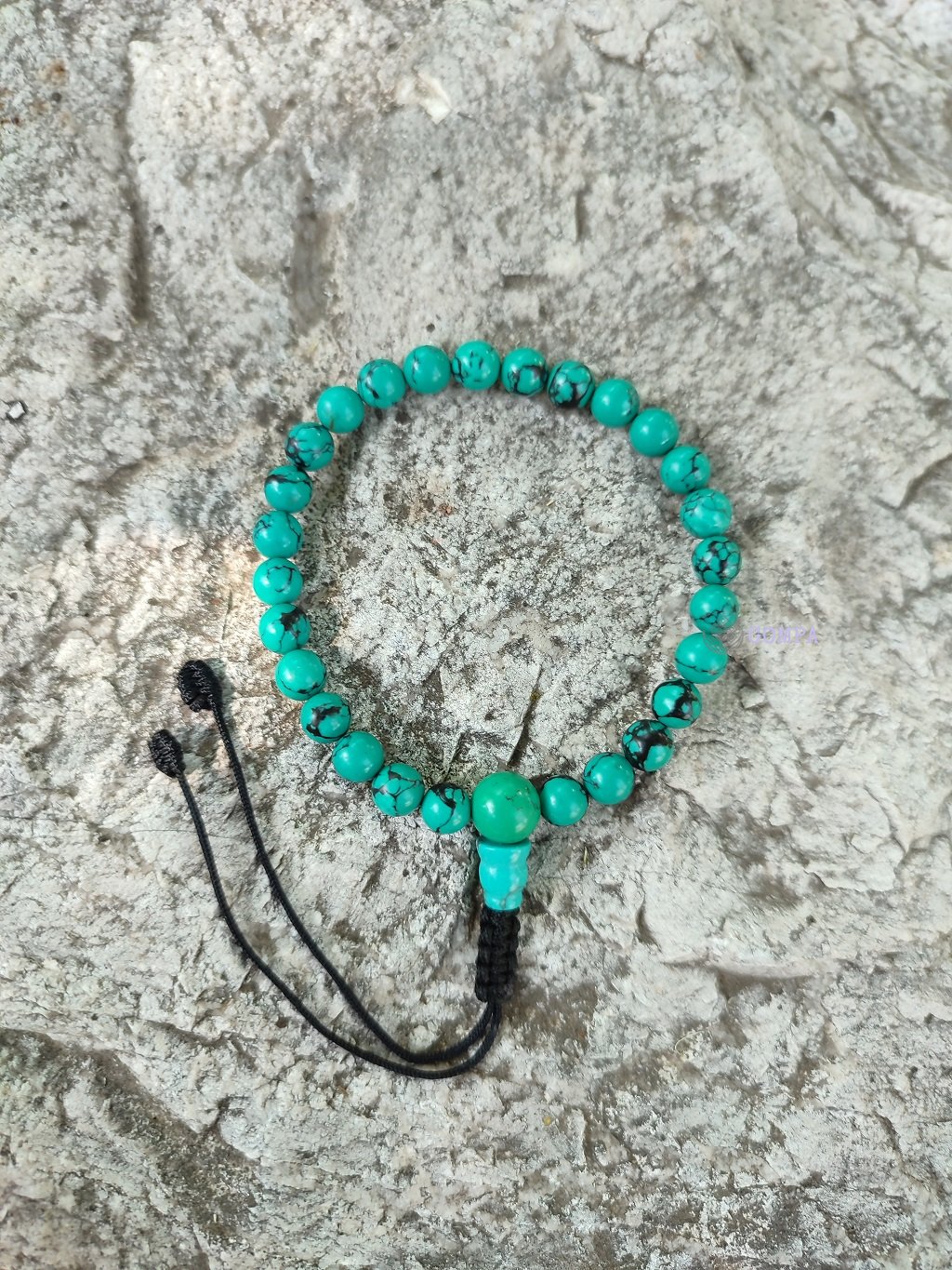 Mala buddhista meditációhoz, 27 db türkiz féldrágakő gyönggyel (6 mm). Állítható méretű. Amikor egy mala elszakad, általában karmikus esemény következménye, ezután el szokták égetni. Azonban van lehetőség újrafűzésre is, melyről üzenetben érdeklődhet. A malát tiszteletben kell tartani, nem érhet hozzá idegen, nem tesszük le az oltáron kívül máshova, csak malatartóban.