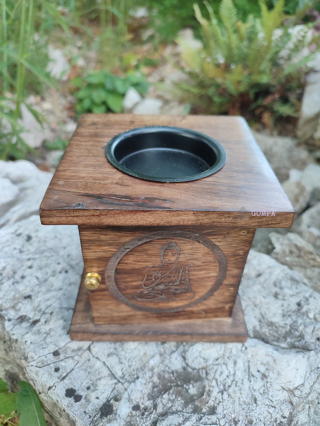 A mangófából készült buddha aromalámpa praktikus, stílusos kiegészítő, amely természetes hangulatot visz minden otthonba. Méretei: kb. 12,5 cm x 12,5 cm x 12,5 cm. Belsejében mécsest kell gyújtani, a tetején lévő tartóba illóolajat tölteni.