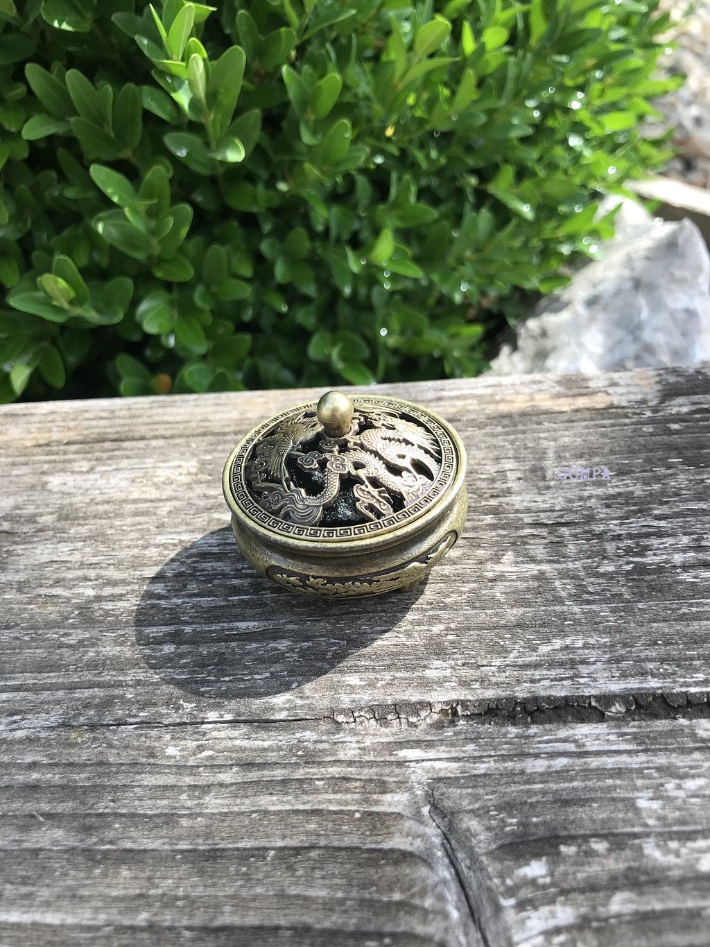 Vintage 3 lábú füstölő tartó fémötvözetből, kb. 3,5 cm átmérőjú és 3 cm magas, mini füstölő tekercshez.