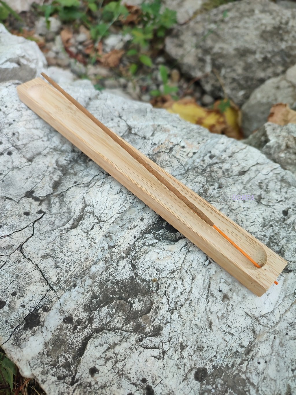 Bambuszból készült füstölő tartó talp, 23 cm hosszú, 2 cm széles és 1 cm magas. A kb. 2mm-es furatba kényelmesen rakható pálcás füstölő.
