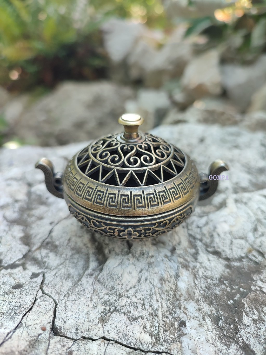 Elegáns, 3 lábú fémötvözet füstölőtartó, fülekkel. Kb. 5 cm átmérőjű, 7,7 cm széles a füleknél, kb. 4,3 cm magas.