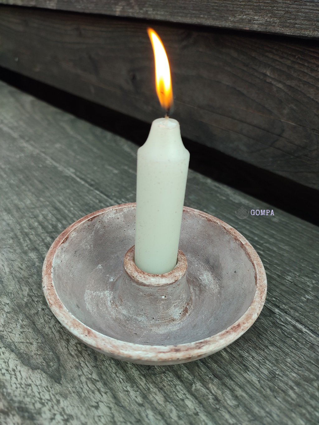 Elegáns gyertyatartó antikolt műkőből (beton), asztali dekorációnak, alkalmakra és hétköznapra is. Méretei: talp kb. 6 cm, közepe 11 cm, belső része 2,2 cm átmérőjű, magassága kb. 3 cm. Asztali, mártott gyertyához, mely külön megvásárolható.