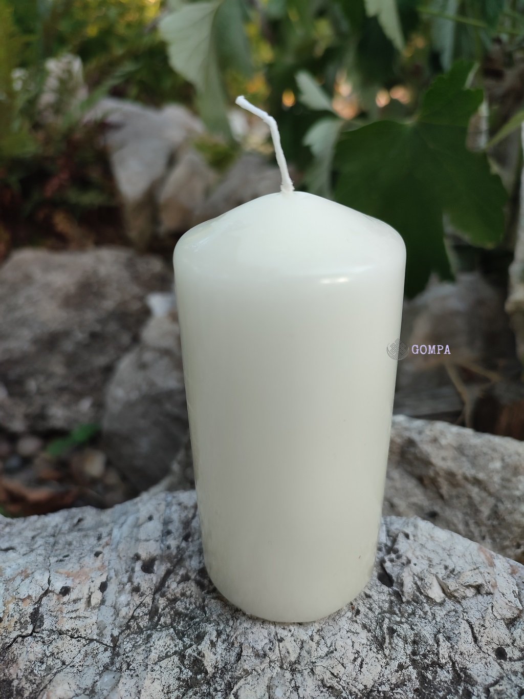 100 mm magas, 50 mm átmérőjű paraffin gyertya. Meditációhoz, kandalló dekorációnak, ünnepi asztal díszítéséhez is kiváló. Krémszínű.