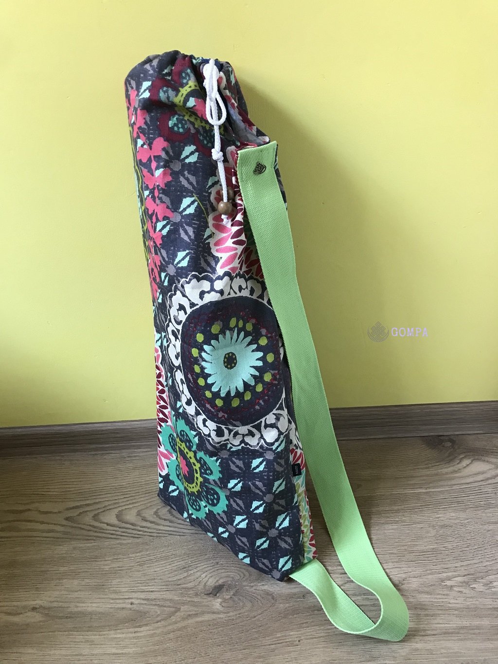 Jóga felszereléshez kiváló vállpántos, zsinórral zárható hátizsák. Vidám, mintás szövet anyagból, fa gyöngy és lótusz díszekkel. Mérete 62 cm x 25 cm x 15 cm.