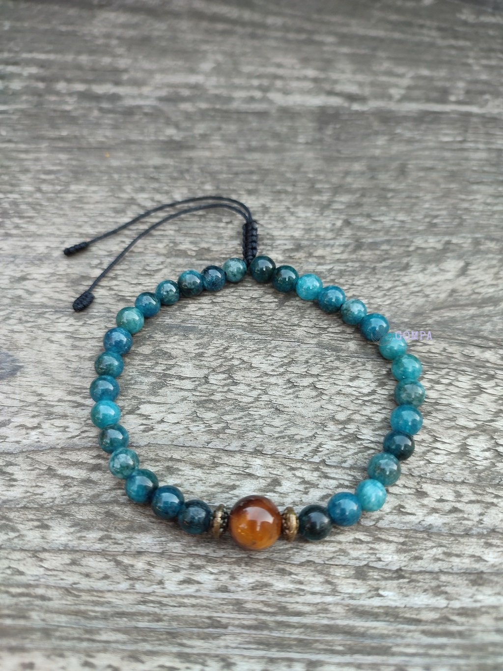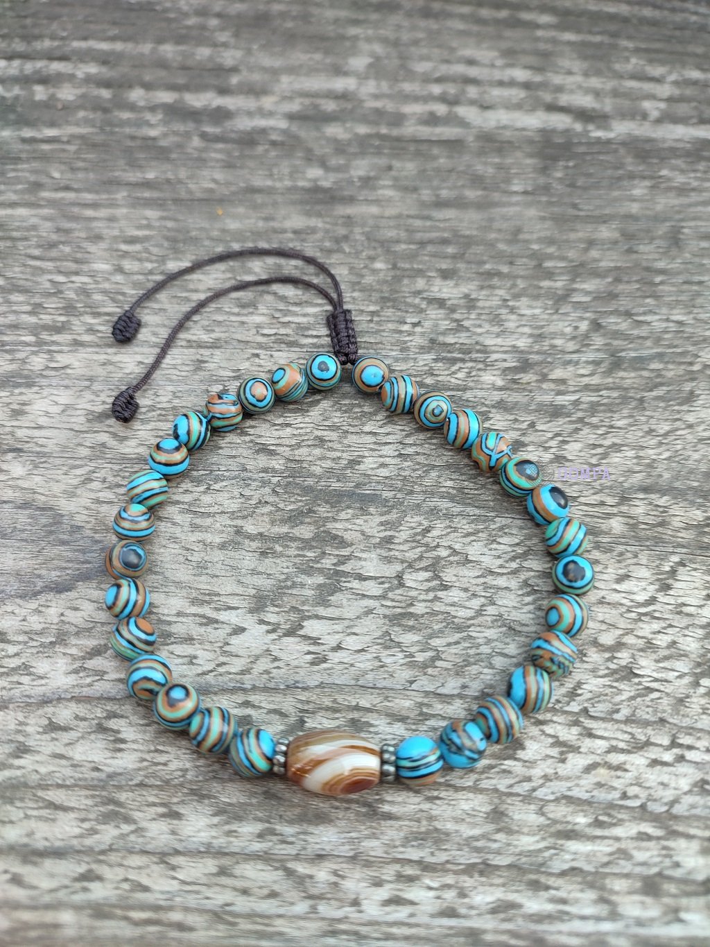 Féldrágakő és szintetikus kő, 6 mm és 8 mm gyöngyökkel. Kb. 6 cm átmérőjű, állítható átmérő kb. 9 cm-ig.