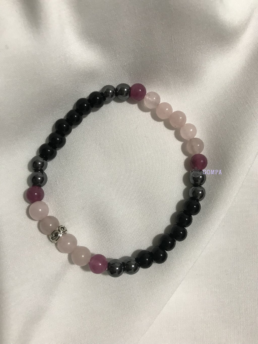Rózsakvarc, rózsaszín- és fekete turmalin, hematit gyöngyökkel. Kb. 7 cm átmérőjű, gumira fűzött, 6 mm-es féldrágakövekkel.
