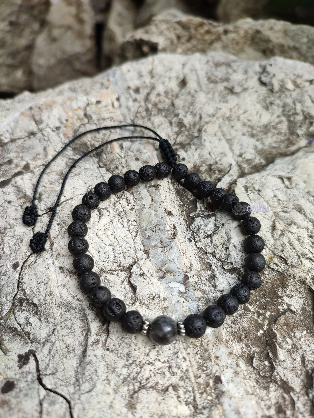 Kb. 6,5 mm-es lávakő gyöngyökkel, középen 8mm labradorit féldrágakő gyönggyel. Kb. 7 cm átmérőjű, állítható átmérő kb 9 cm-ig.
