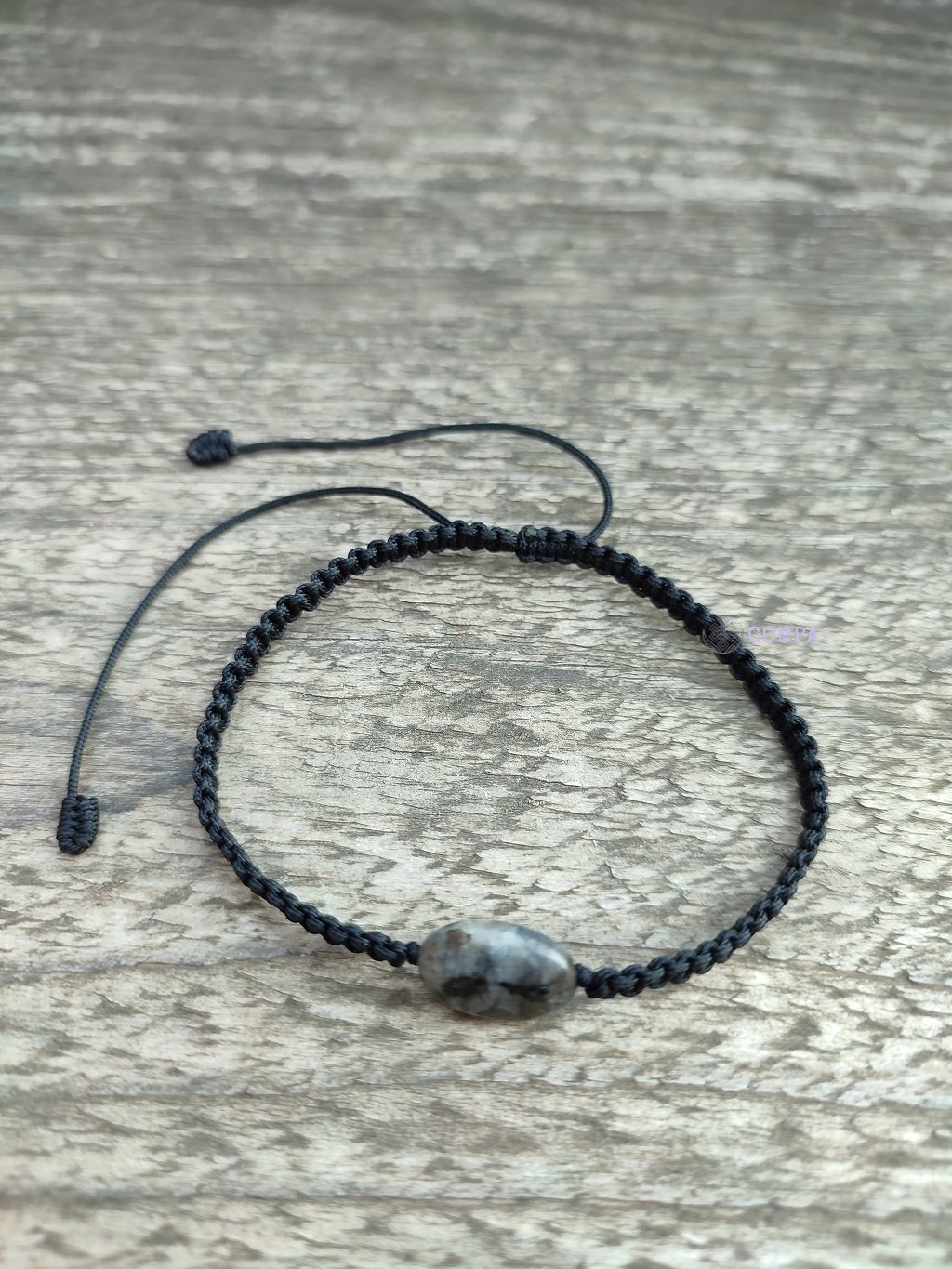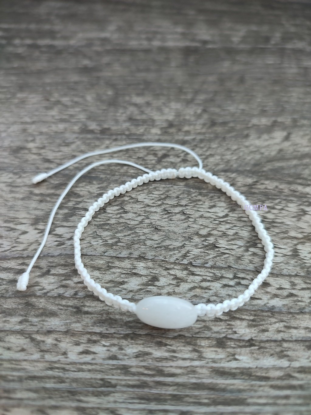 Minimalista stílusú, mikromakramé karkötő, ovális féldrágakövekkel, bármilyen alkalomra, hétköznapra. Kb. 5 mm széles, 6 cm átmérőjű, mely egyszerűen állítható.