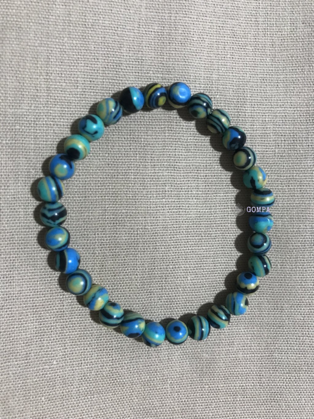 Szintetikus kövekből készült. Kb. 7 cm átmérőjű, gumira fűzött, 6 mm-es gyöngyökkel.