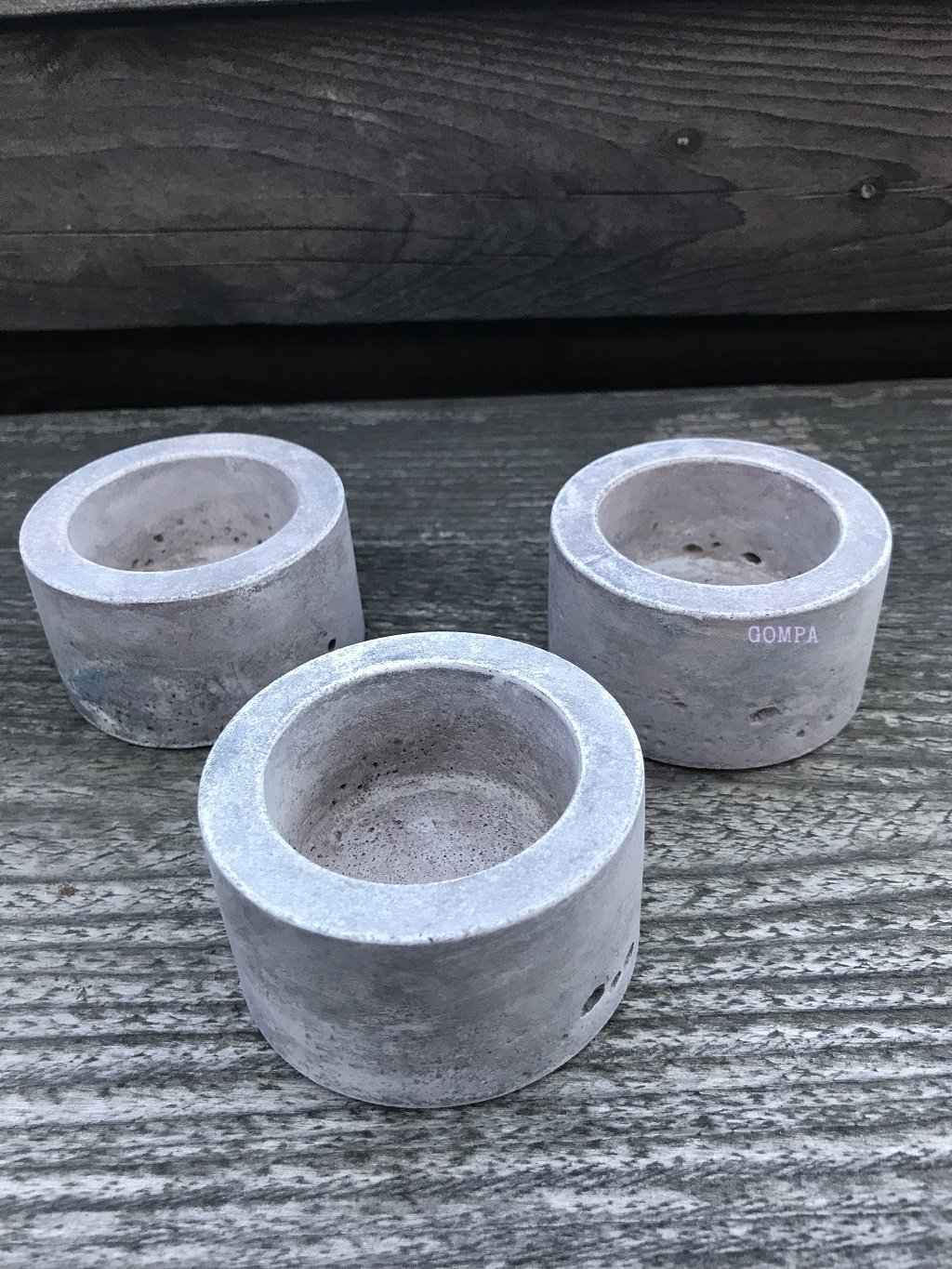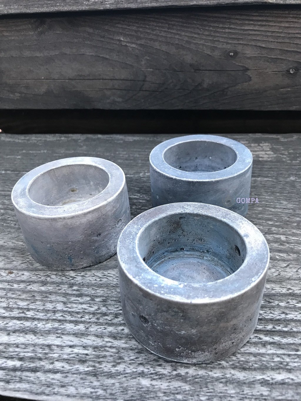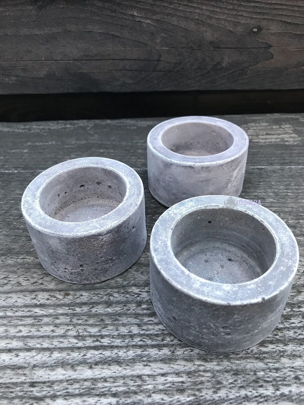 Elegáns mécsestartókból álló 3 db-os szett, antikolt műkőből (beton), asztali dekorációnak, alkalmakra és hétköznapra is. A szettek színárnyalati eltérőek, barnás, kékes, szürkés színekkel. Egy mécsestartó méretei: kb. 7 cm átmérőjű henger, belső rész 5cm átmérőjű, magassága 4 cm. A termékekhez a mécses külön kapható.