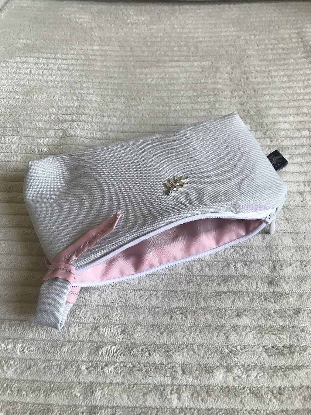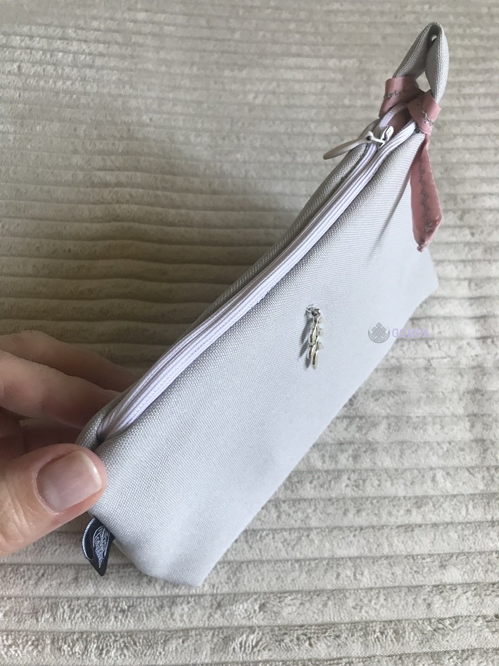 Cipzáras neszeszer levél dísszel és leveles varrással. 17 cm hosszú és 9 cm magas kényelmes tartó, poliészter anyagból.