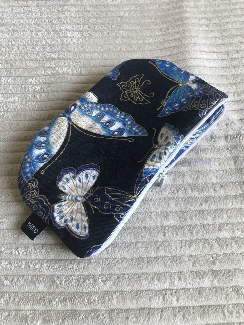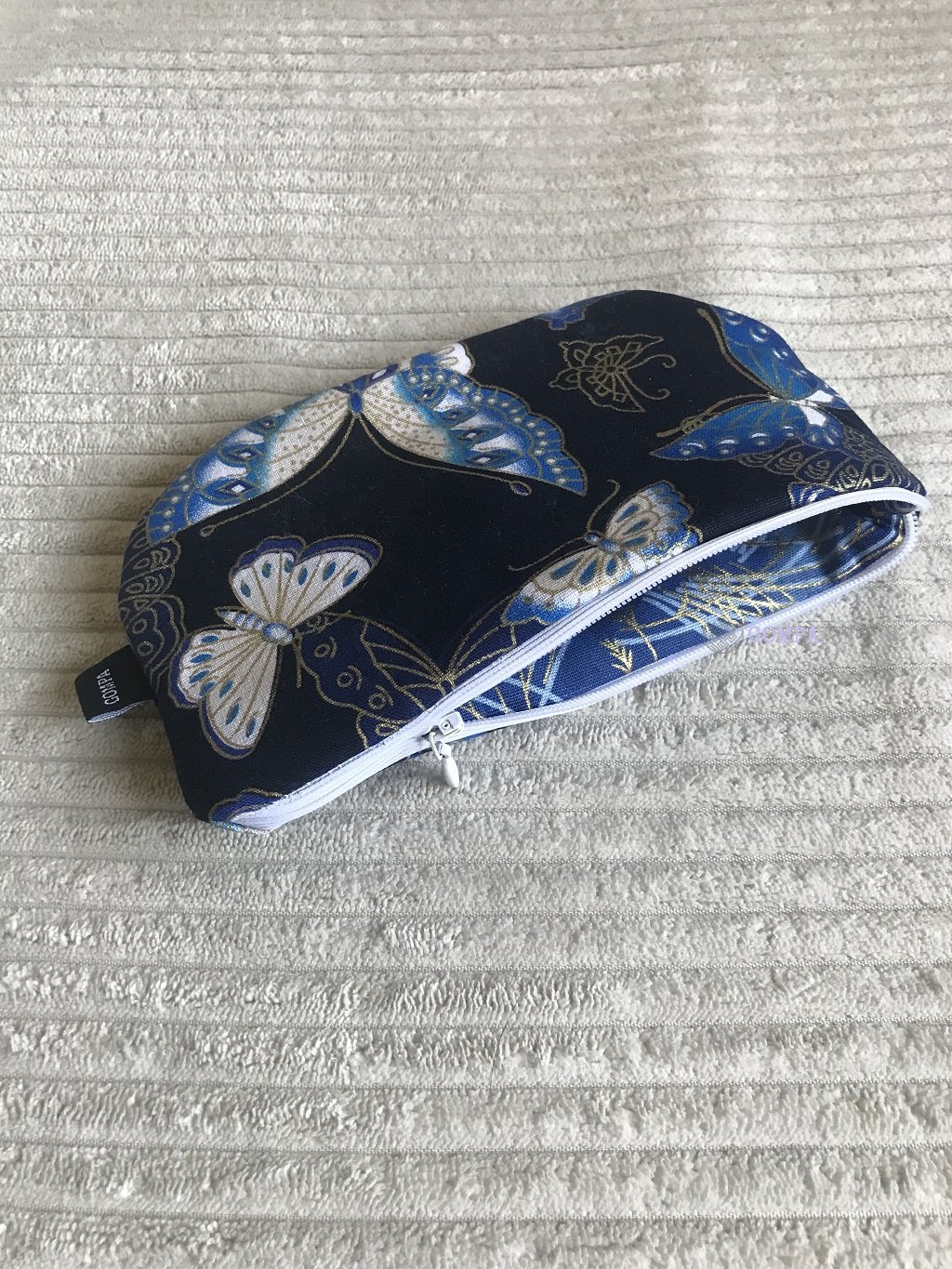 Cipzáras neszeszer pillangókkal. 17 cm hosszú és 9 cm magas kényelmes tartó, poliészter anyagból.