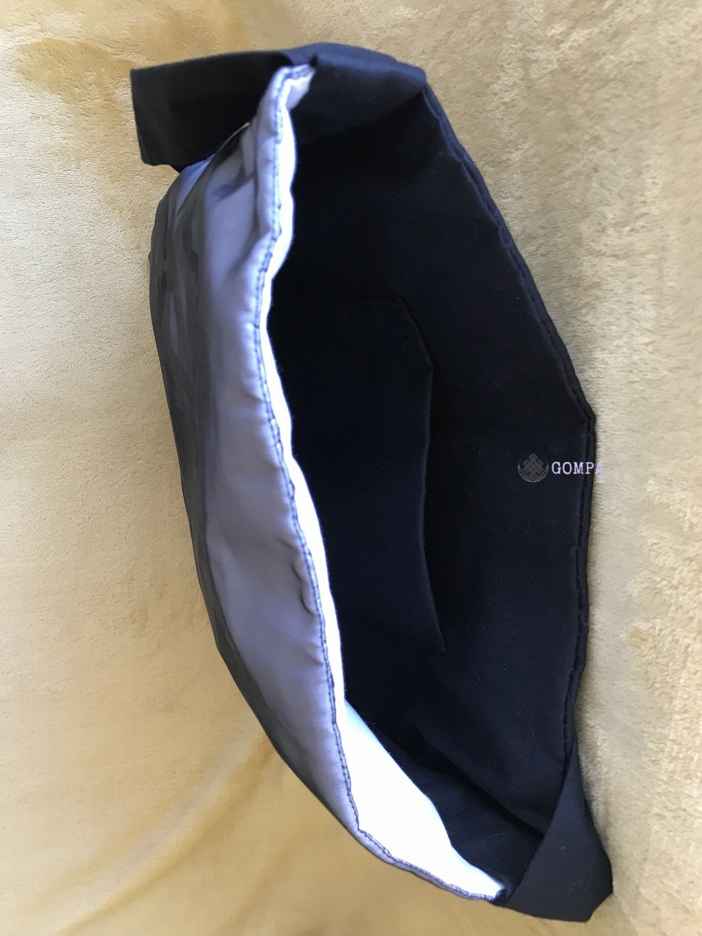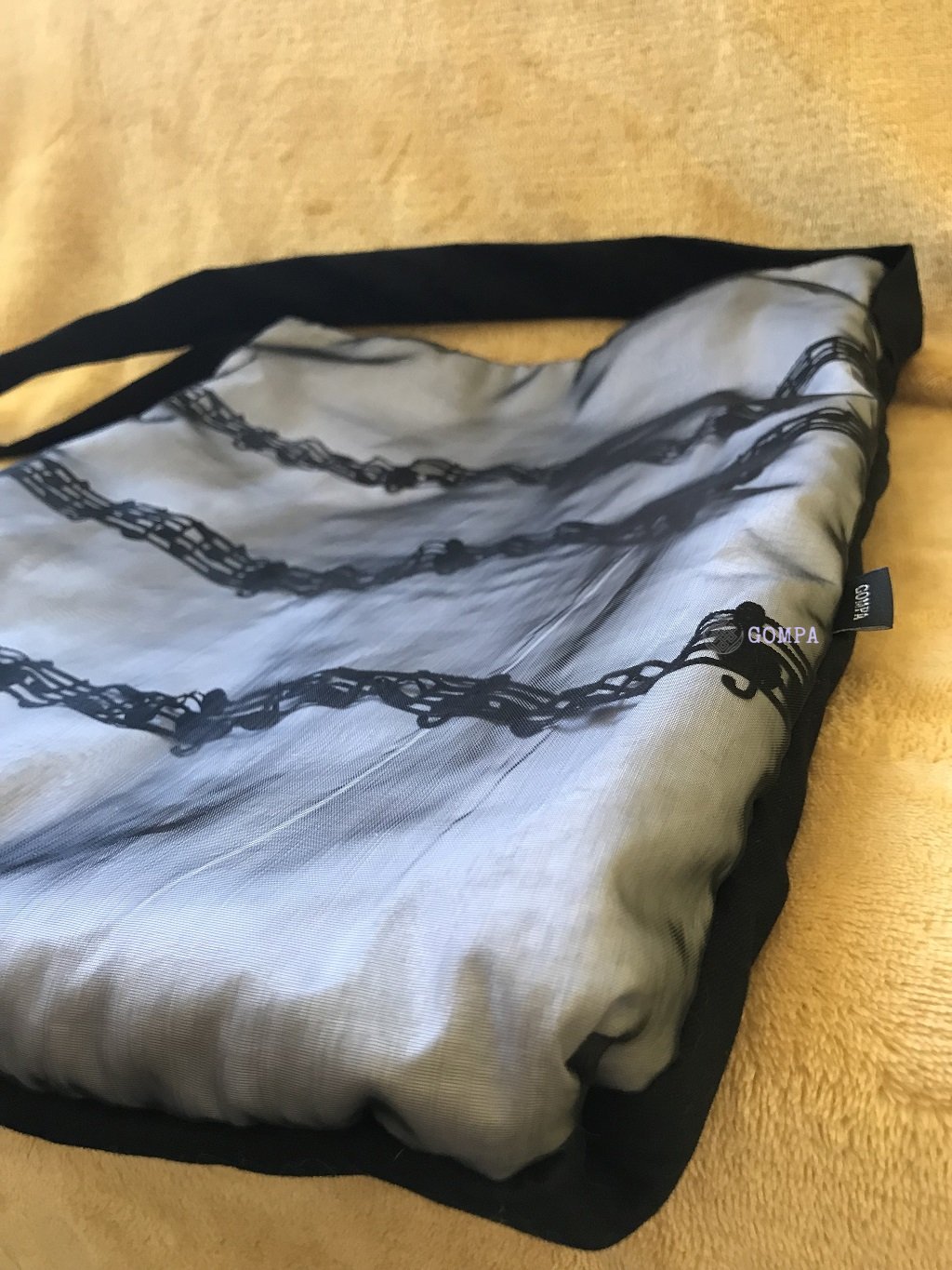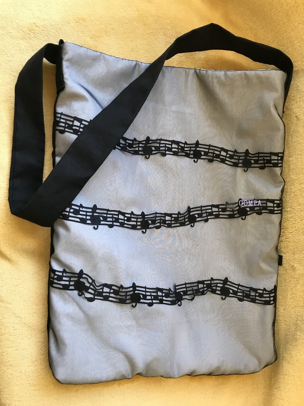 Kényelmes válltáska, egy belső zsebbel, rejtett mágnescsattal, kotta mintával, poliészter és pamut anyagból. Mérete 28 cm x 38 cm x 4 cm.