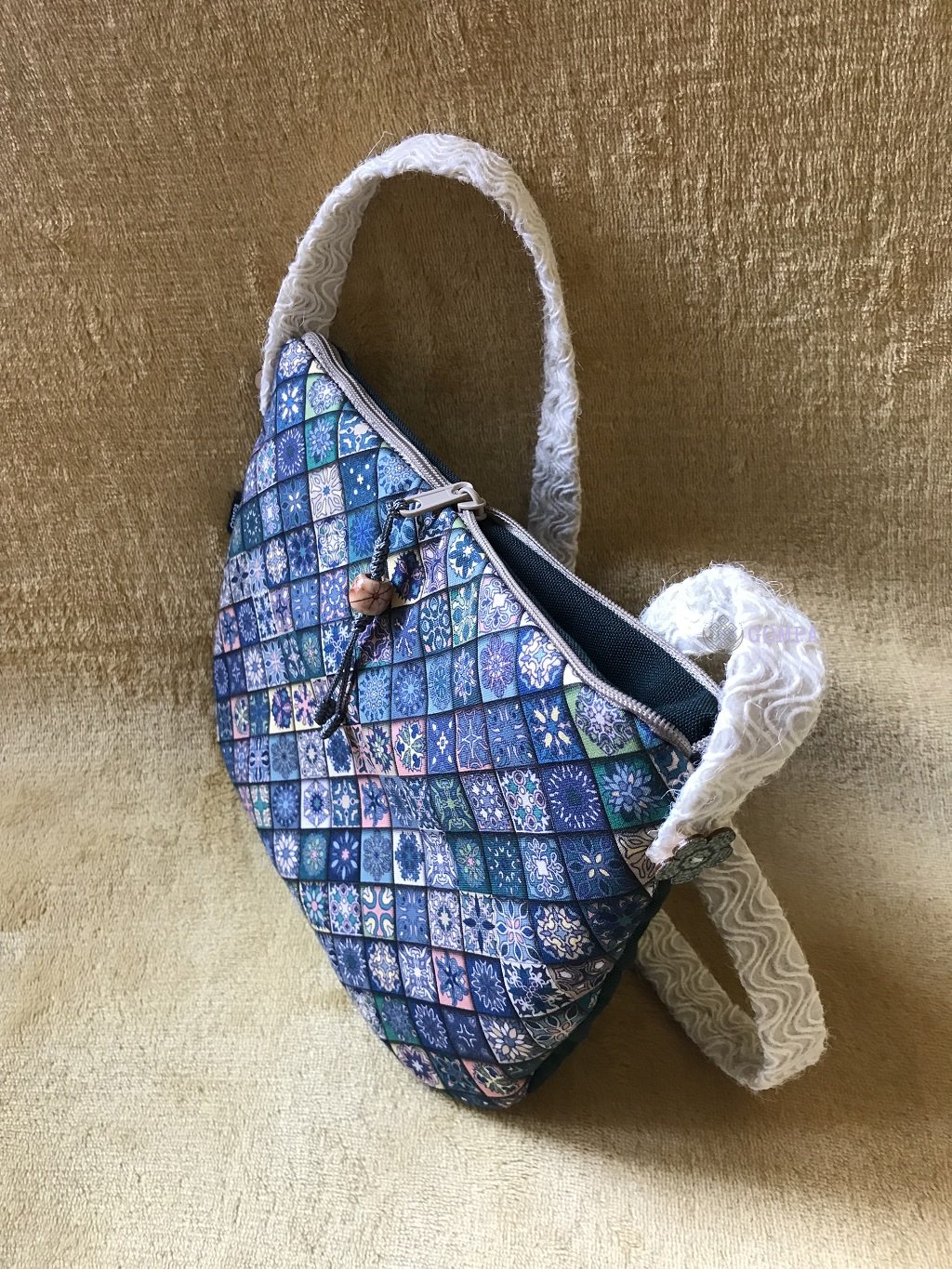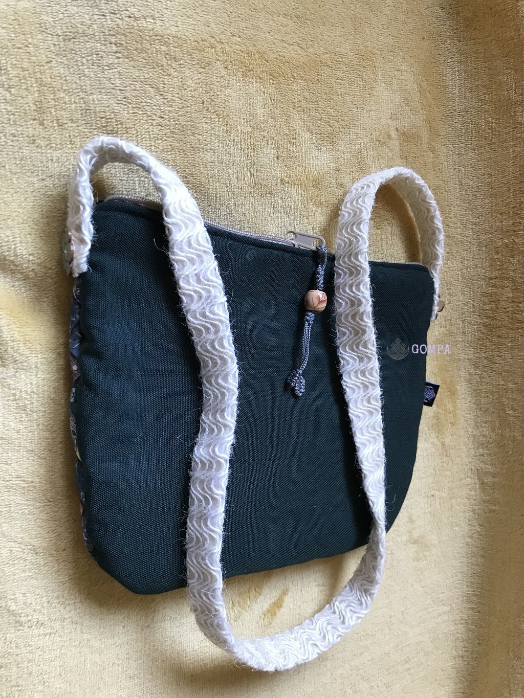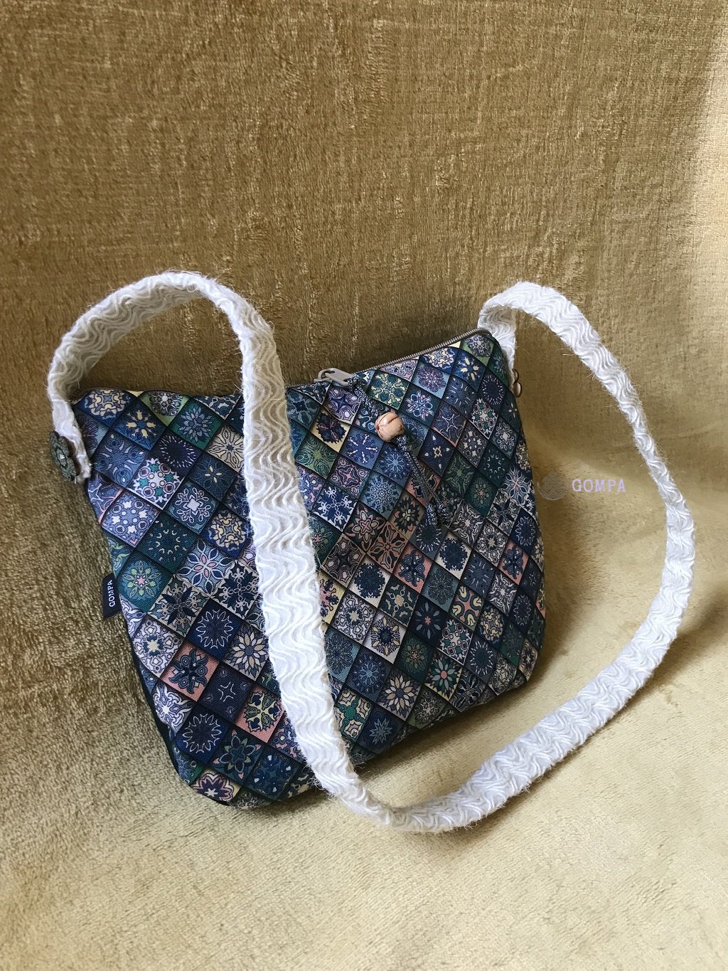 Elegáns cipzáras válltáska, mandala mintával, divatos színekkel, poliészter és len anyagból, fonott, díszes cipzár húzóval. Mérete 22 cm x 17 cm x 2 cm.