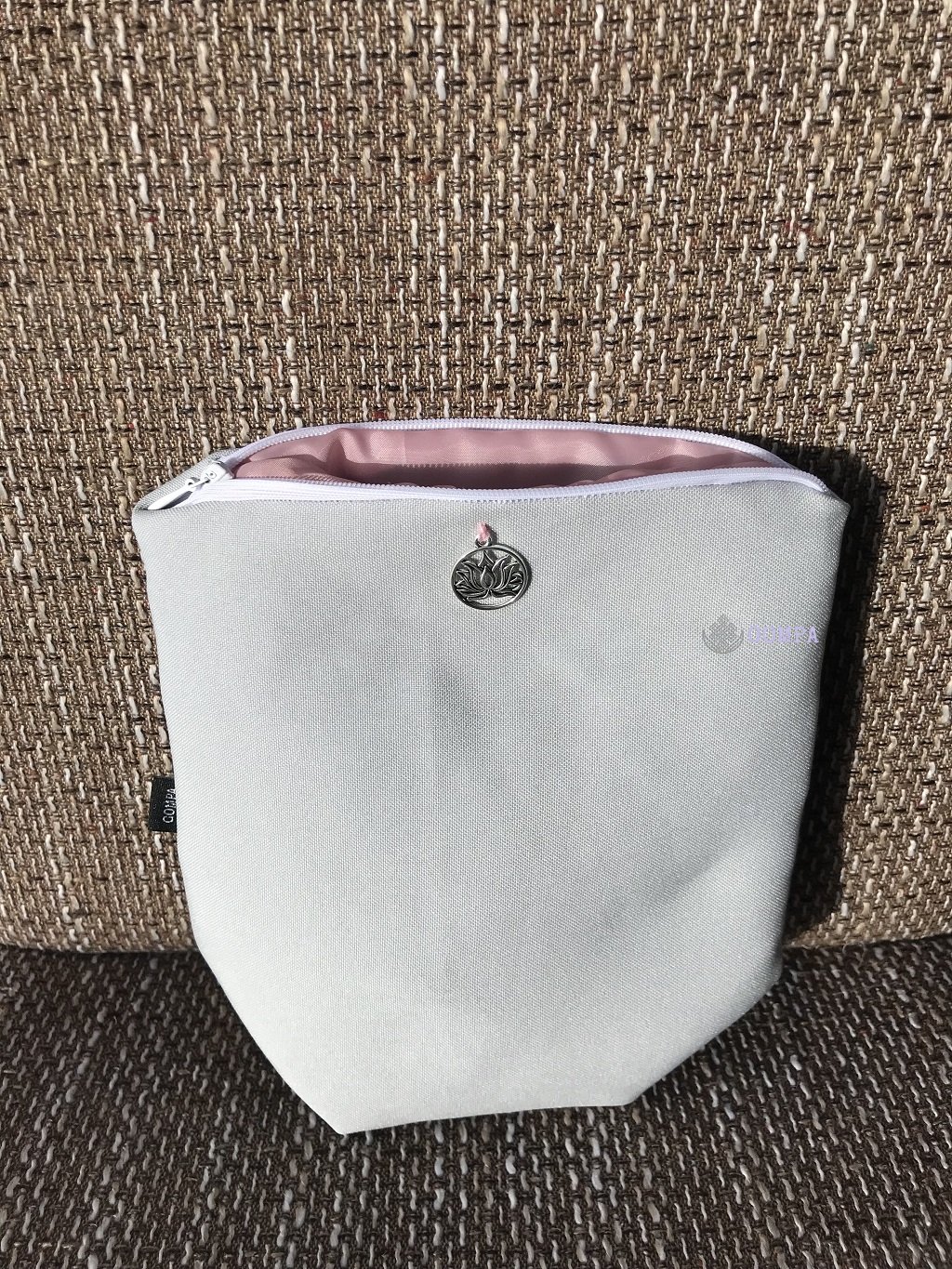 Elegáns cipzáras táska, egyszínű, szürke szövet anyagból, lótusz dísszel. Mérete 18 cm x 18 cm x 9 cm.